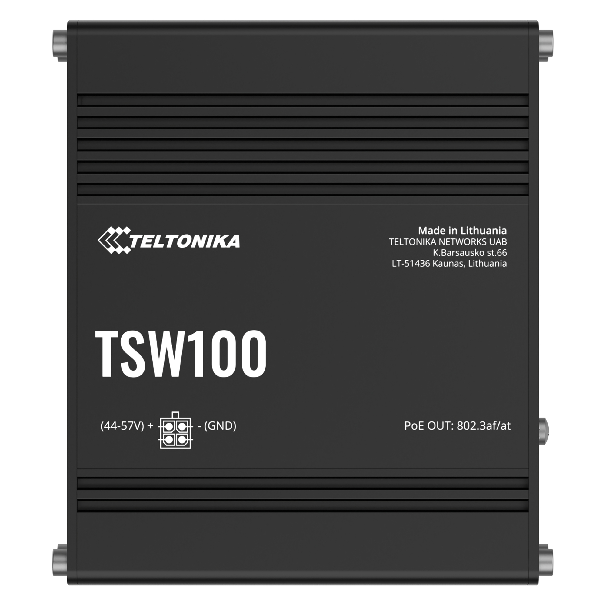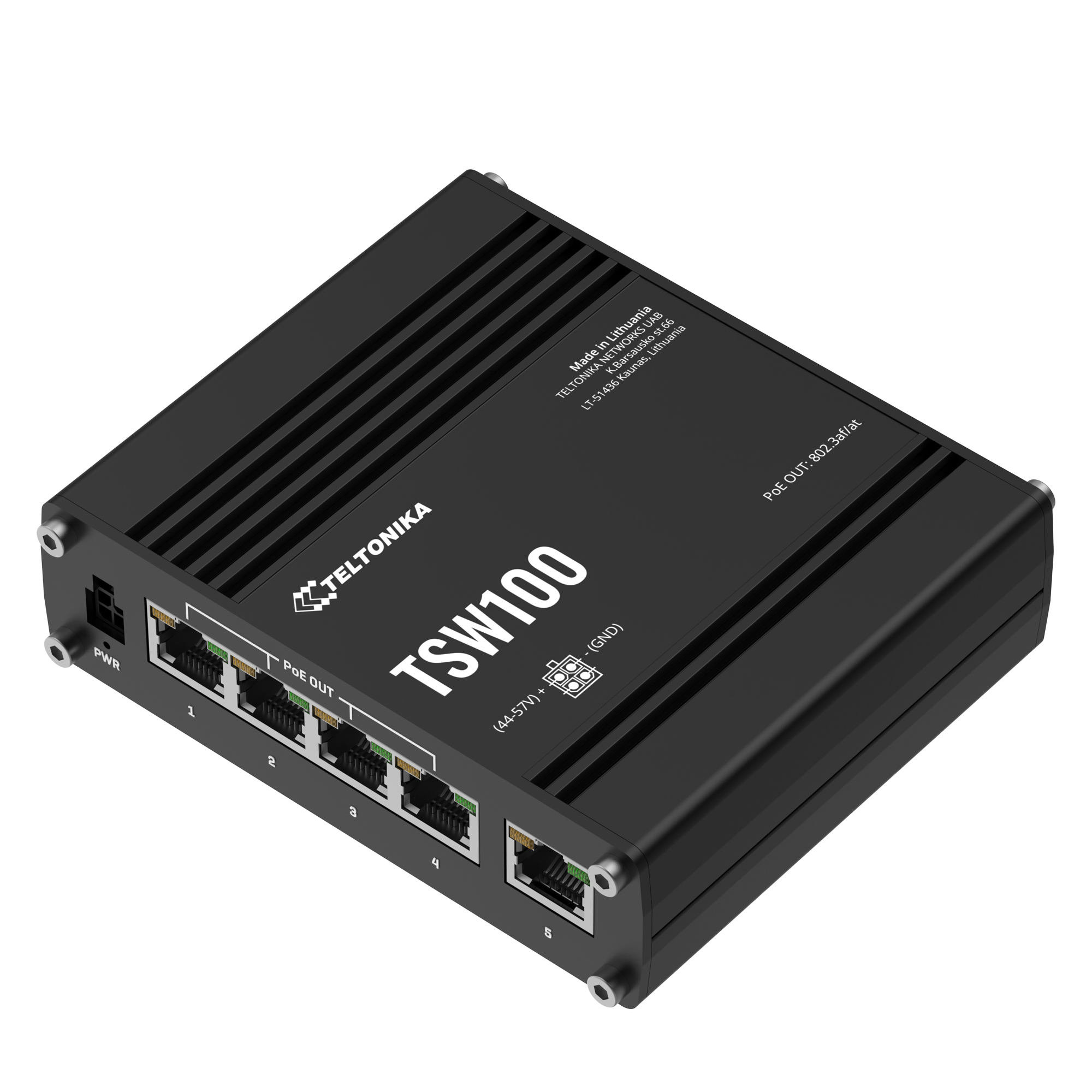 TSW100 є першим промисловим некерованим комутатором Teltonika Networks. Оснащений п'ятьма портами Gigabit Ethernet, чотири з яких підтримують стандарти IEEE802.3af та IEEE802.3at Power-over-Ethernet (PoE). Класифікується як обладнання джерела живлення (PSE), він дозволяє централізувати джерело живлення забезпечуючи до 30 Вт на порт і скорочуючи витрати на установку живлення. Має порти Ethernet 10/100/1000 Мбіт/с для економічного рішення з високою пропускною здатністю. Ідеально підходить для професійних рішень з високою пропускною здатністю, забезпечуючи як надійне з'єднання передачі даних, так і джерело живлення.